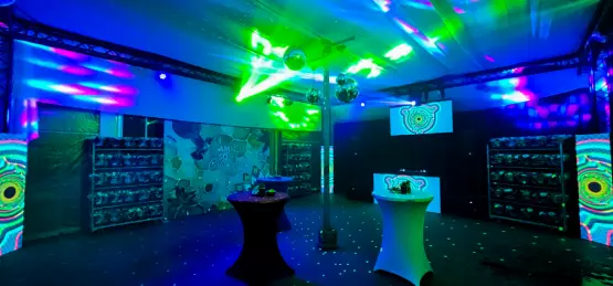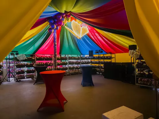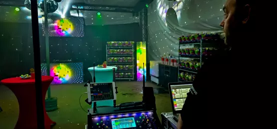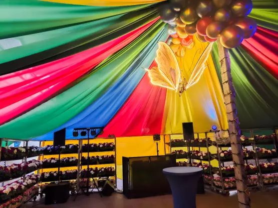 De uitdaging bij Ammerlaan Sosef is uniek: een actieve, kale logistieke ruimte binnen 24 uur transformeren tot een intieme feestplek. Waar het eerste jaar de nadruk lag op organische decoratie en bewegende elementen (Venetian), verschoof de focus het jaar daarna naar techniek, visuals en een 360-graden beleving (Disco).