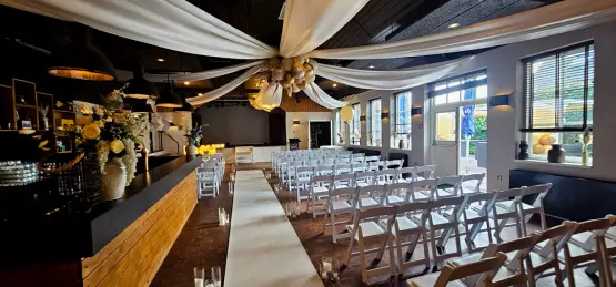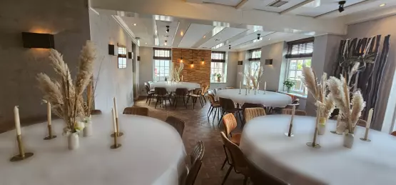 De wens van het bruidspaar was een warme, natuurlijke sfeer die zowel binnen als buiten één geheel vormde. Door pampaspluimen en droogbloemen te verweven in organische ballondecoraties, creëerden we een zachte en luxe uitstraling. Van de witte loper met windlichten bij de ceremonie tot de gepersonaliseerde pilaren in de buitenlucht; elk detail was in perfecte harmonie.